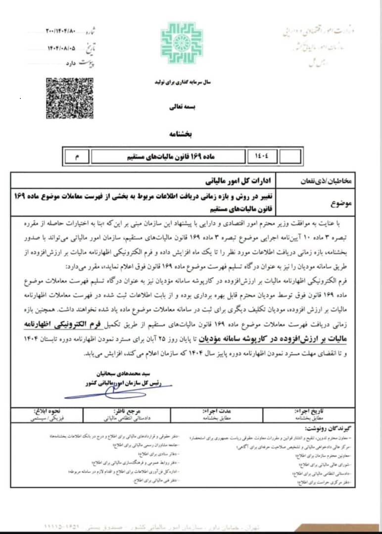 ▫️با توجه به اینکه از تاریخ اول دی ماه ۱۴۰۴ صورتحساب های خارج از سامانه مودیان فاقد اعتبار خواهند بود بر این اساس بخشنامه فوق ابلاغ شد