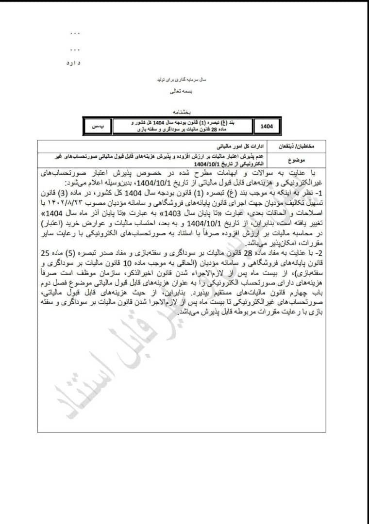 عدم پذیرش اعتبار مالیات بر ارزش افزوده و پذیرش هزینه های قابل قبول مالیاتی صورتحسابهای غیرالکترونیکی از تاریخ ۱۴۰۴/۱۰/۰۱